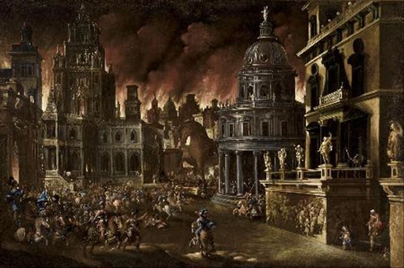 Se representa la caída de la ciudad de Troya, los griegos conquistan la ciudad y se observa la ciudad en llamas con los ejércitos. La pintura está inspirada en el canto segundo de la Eneida de ...