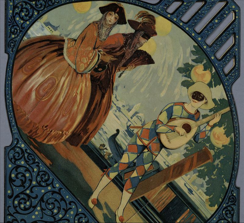 Se trata de la imagen de un calendario ilustrado con una escena del carnaval veneciano. Se observa a una especie de arlequín con mascara tocando un instrumento de cuerda pulsada que parece una ...
