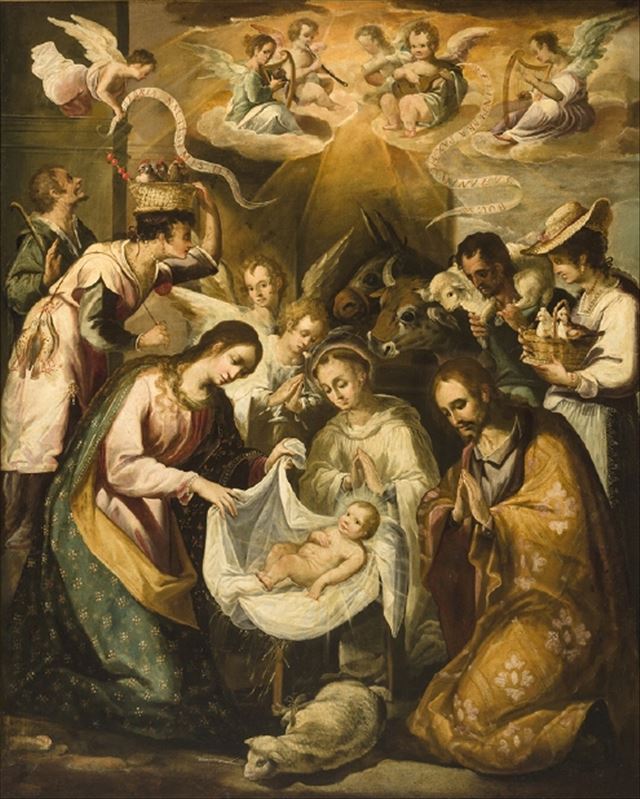 La escena se desarrolla en torno a la figura del Niño Jesús que está en un pesebre en el centro del primer plano de la composición. A su izquierda se halla la Virgen, quien, arrodillada, levanta el ...