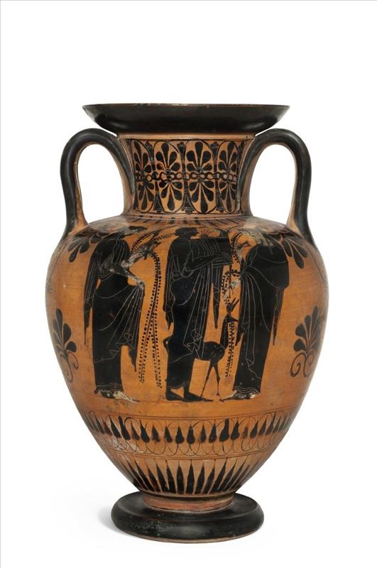 El cuello del vaso muestra a una sirena citarista, flanqueada por Eros y un cisne, sobre un fondo de exuberante vegetación de roleos, acaso como alusión al paraíso más allá de la muerte. En la panza ...