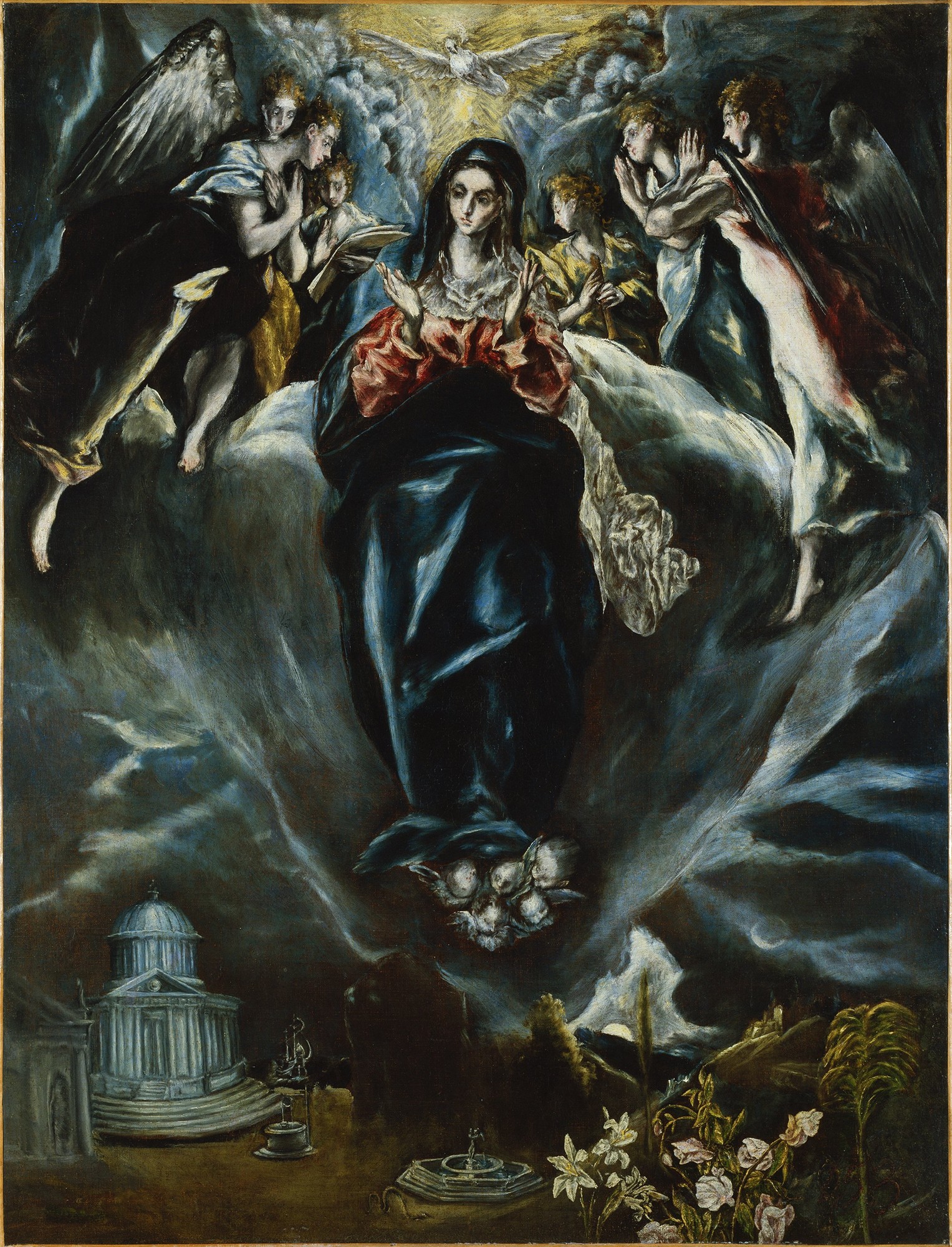 La protagonista de la pintura es una Virgen alargada que flota en el cielo rodeada de ángeles músicos sobre nubes. A sus pies hay grupo de querubines a sus pies. En la zona inferior, El Greco abre un ...