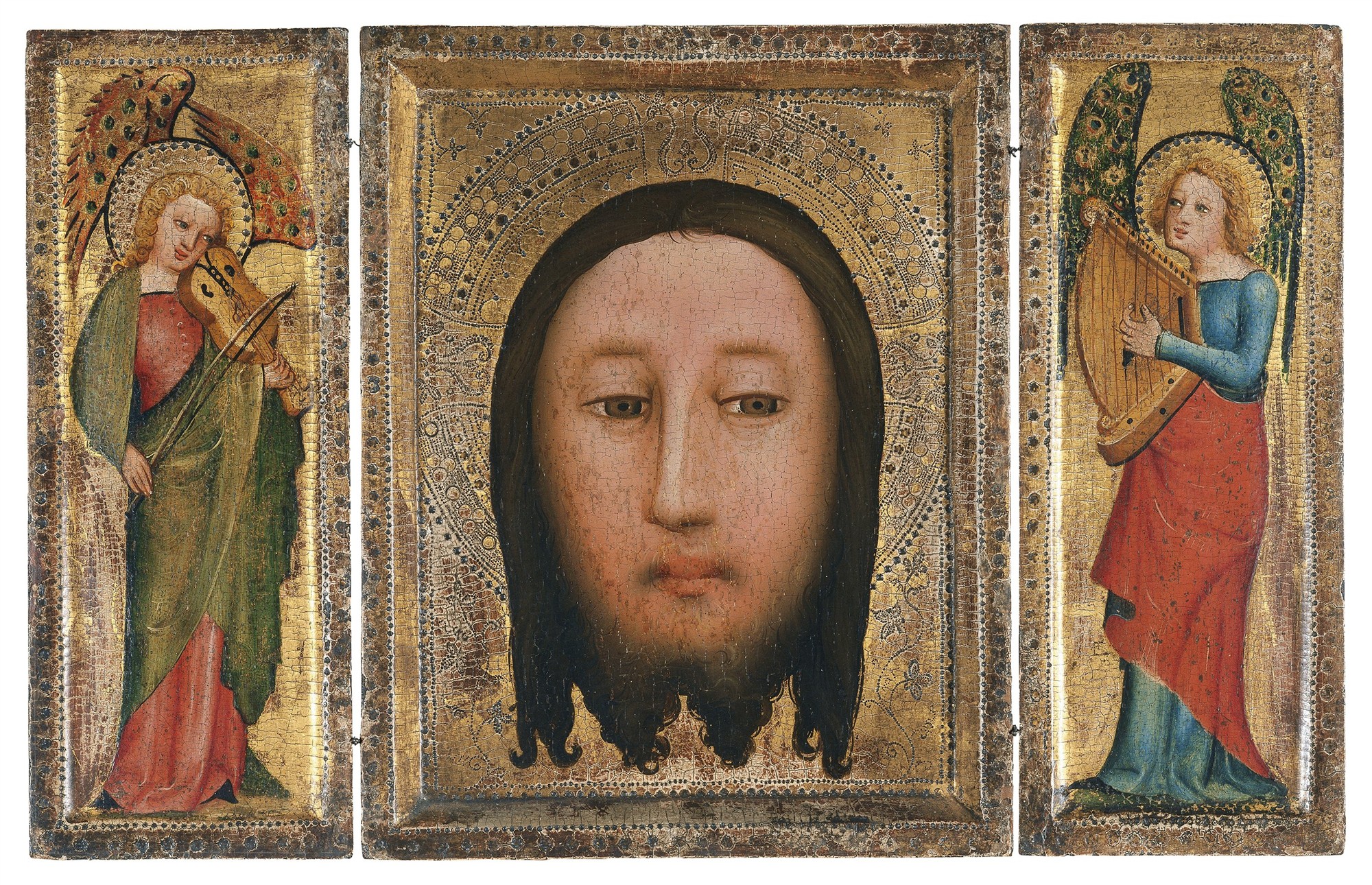 En la tabla central se presenta el rostro de Cristo frontalmente, con rasgos suaves y expresión hierática. A ambos lados de la Santa Faz, en las alas interiores, se encuadran dos ángeles músicos ...