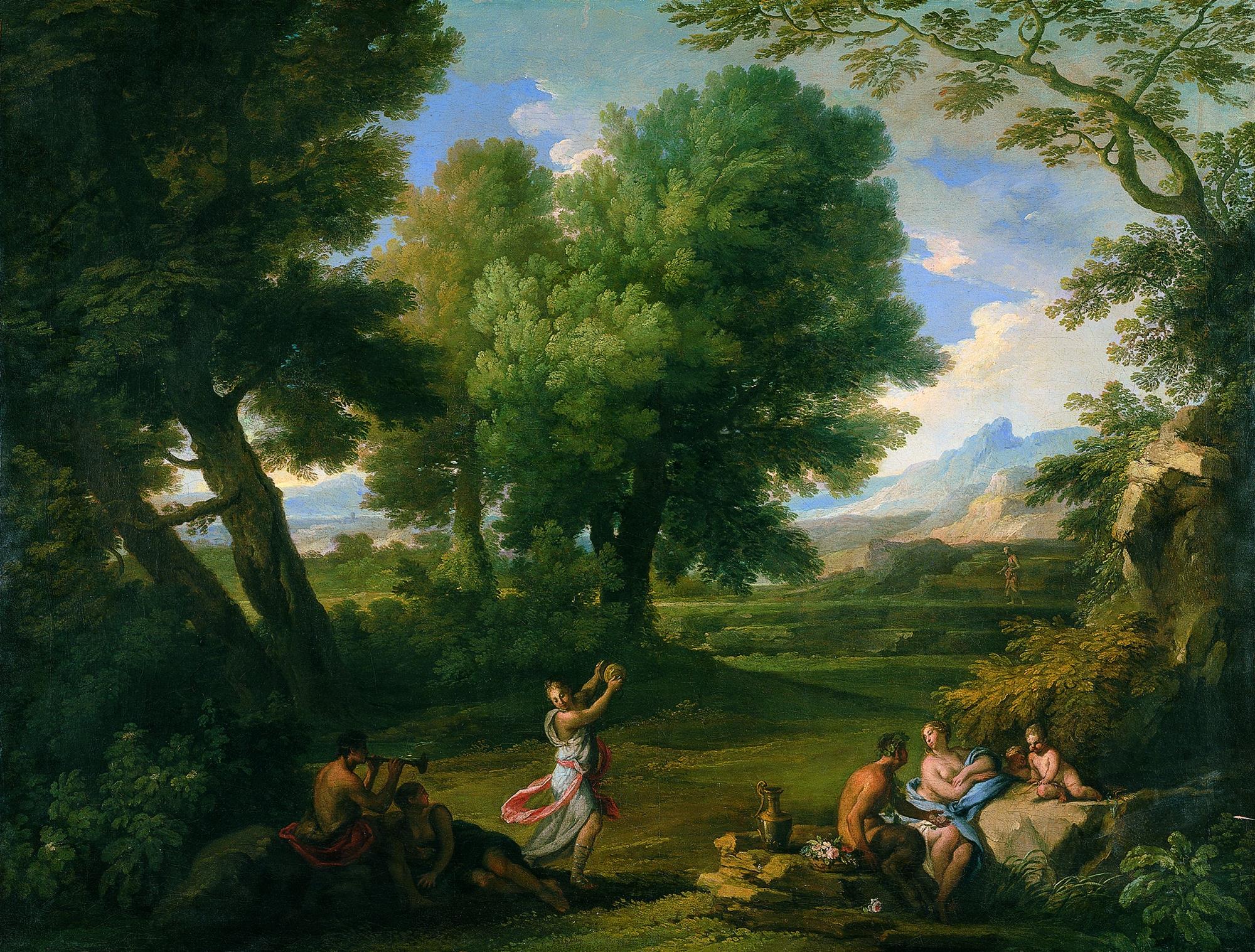 Escena mitológica basada en un bosque. Se observan árboles, arbustos, hierba, rocas y montañas al fondo. El cielo es azul, con nubes. Los protagonistas son ninfas, sátiros y niños tañendo diferentes ...
