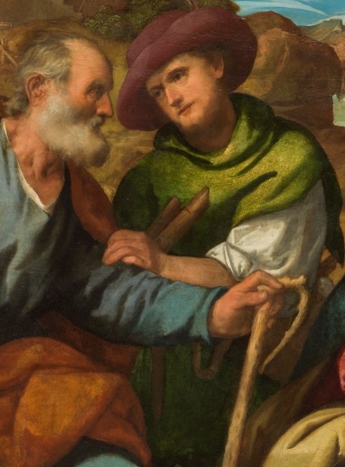 El pastor, vestido de blanco y verde, porta un sombrero granate. En una de sus manos sujeta una flauta dulce.