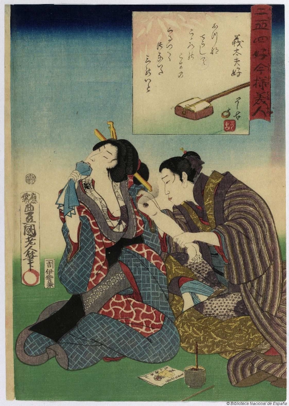 Se trata de un cordófono pulsado que se interpreta con un plectro. Su cuerpo posee una forma cuadrada con las esquinas redondeadas. Se puede apreciar un pequeño puente por donde pasan las cuerdas. No se aprecia con claridad el número de cuerdas, pero probablemente sean 3. Se observa un largo mástil, pero no el clavijero ya que la imagen se corta.