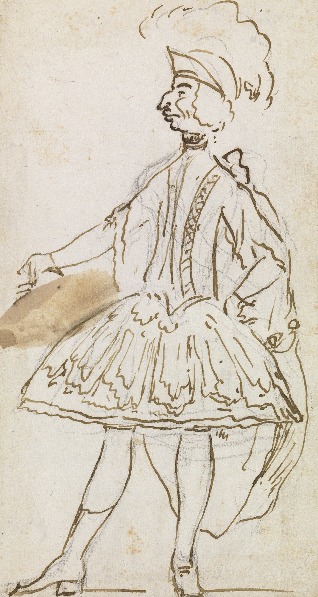 Annibale Pio Fabbri estuvo en España desde 1737. El cantante en un papel clásico: de pie con su cabeza mostrando su perfil izquierdo, su brazo derecho extendido y su mano izquierda apoyada en la cadera. Lleva un casco con plumas, peluca corta, túnica de amplio vuelo y vestido.