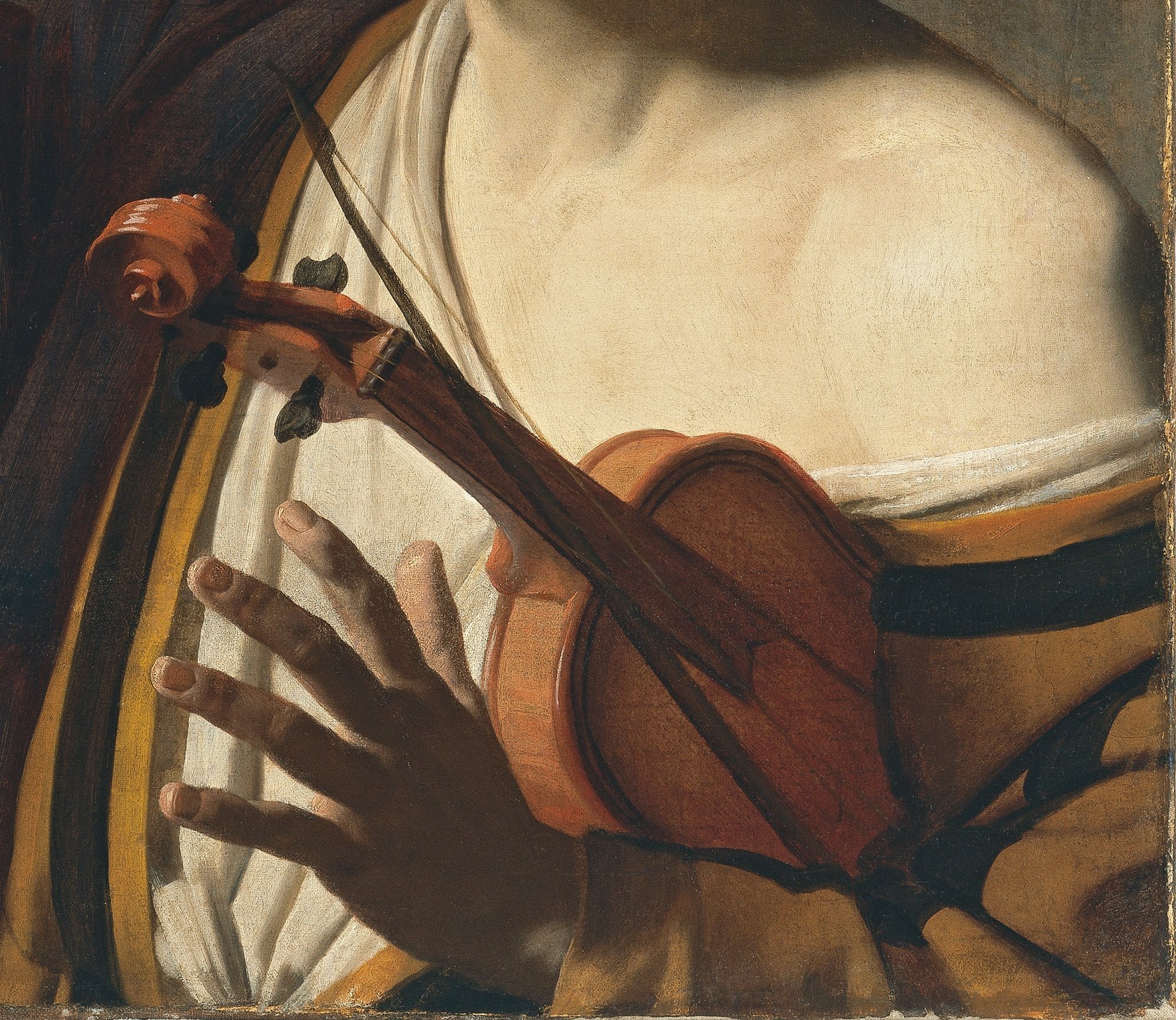 La voluta es muy brillante. El clavijero tiene cuatro clavijas con la forma propia de la época, aunque sólo se han descrito tres cuerdas. Se ve el diapasón de color oscuro y la parte superior de los aros y la tapa armónica. Un arco está sostenido y cruzado entre las cuerdas.