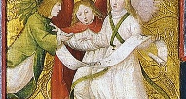 Se corresponde con la Adoración de los pastores, donde el pintor se apoya en el grabado La Adoración del Niño, de Schongauer, del que toma el grupo de ángeles cantores y la figura de san José. El maestro anónimo completa la composición con el grupo de ángeles que rodea a Jesús en la cuna y con los pastores. (Mar Borobia).
