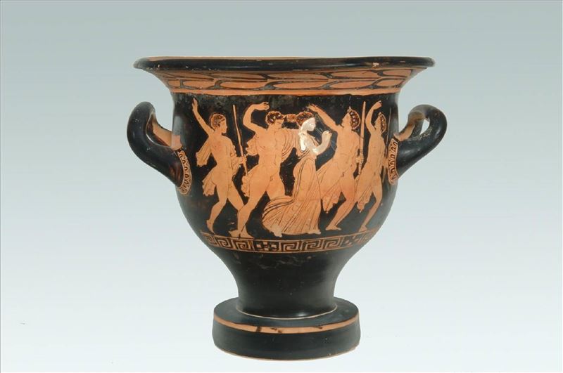 Escena de bacanal en un claro del bosque con un grupo de ménades y faunos danzando. En el centro de la composición, un fauno tocando una flauta dulce y una ménade que baila con una sonaja circular en ...