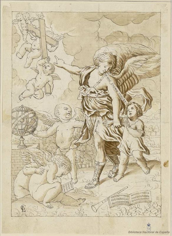 Un dibujo sobre papel amarillento verjurado: pluma, pincel, tinta y aguadas pardas. El ángel conduce a un niño de la mano y le señala la cruz que, sostenida por ángeles niños, aparece en un ...