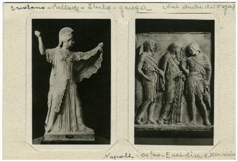Dos fotografías en blanco y negro mate, una de ellas, con una representación de Orfeo y Eurídice.