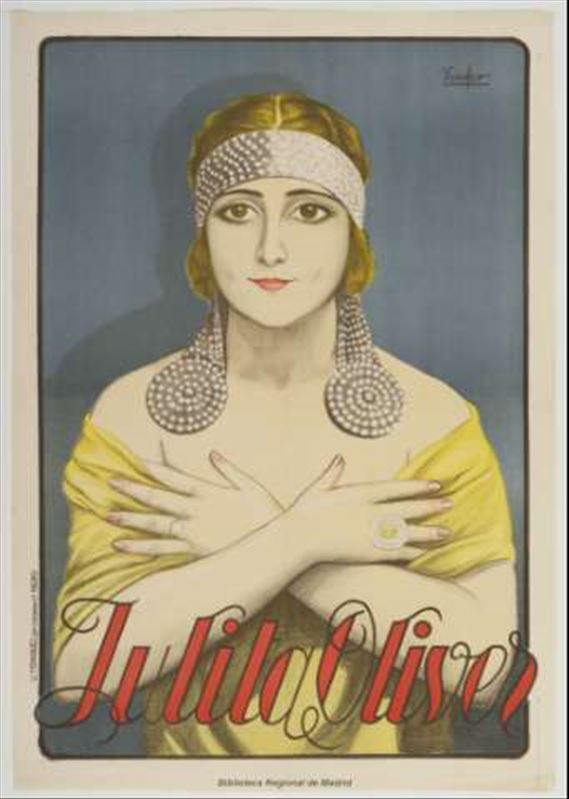 Cromolitografía de la vedette Reyes Castizo sobre ilustración carente de firma del autor. Se trata de un retrato de cuerpo entero los brazos y piernas en acción de giro, movimiento que resaltan los ...