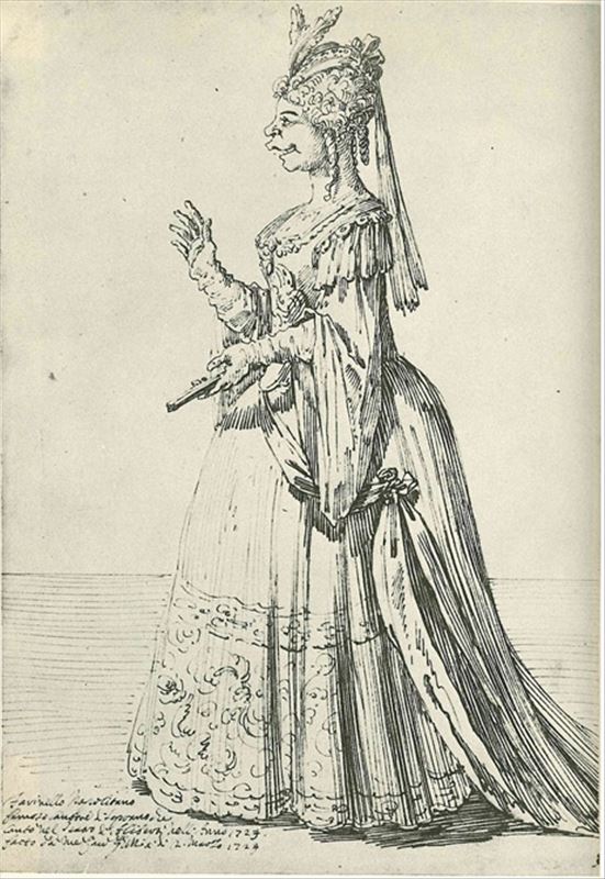 La Tesi estuvo en España en 1739 y 1740. La caricatura fechada en 1742, nos muestra su poderío físico. Vemos su perfil izquierdo con peluca, coleta posterior, lunares y gargantilla. Un corpiño ...