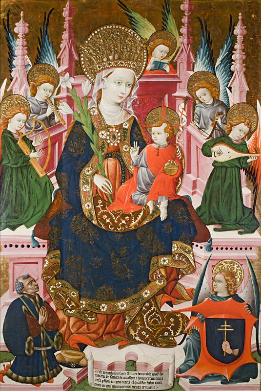 Pintura dedicada a la Virgen María. Sostiene al niño Jesús sobre su rodilla izquierda. Cinco ángeles músicos se sitúan a su alrededor.