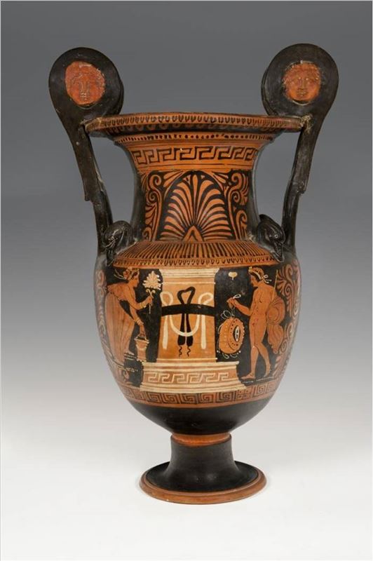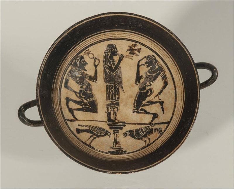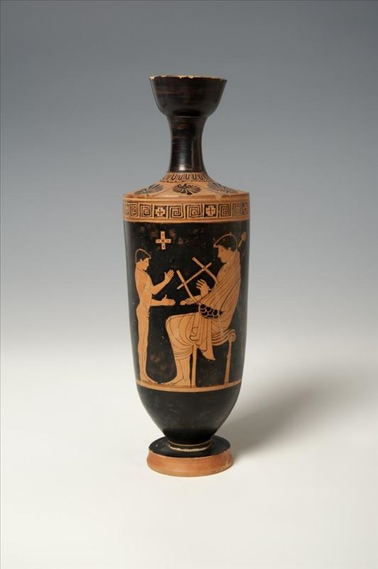 Escifo de figuras rojas cuya decoración está asociada a a las costumbres propias de la sociedad ateniense de época clásica: la paideia de los jóvenes atenienses, basada esencialmente en las ...
