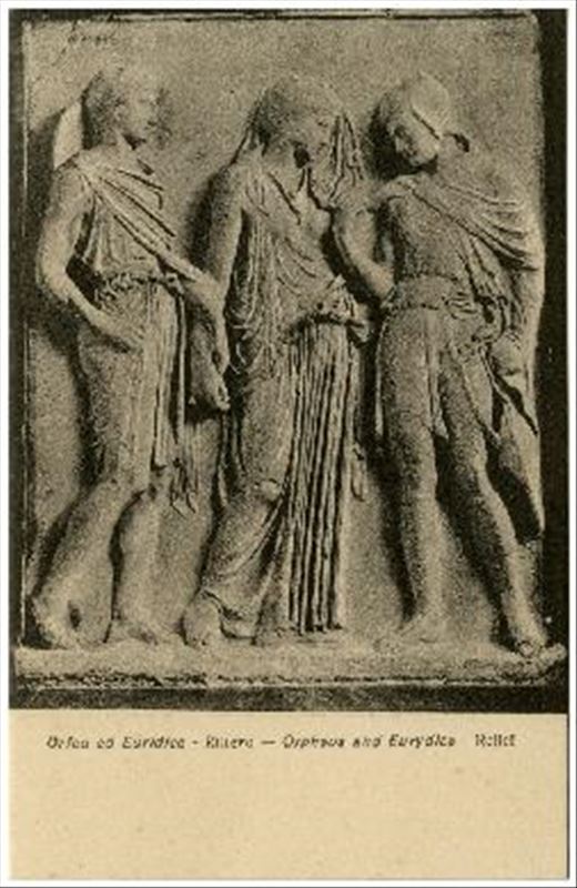 Tarjeta postal en blanco y negro con una representación de Orfeo y Eurídice