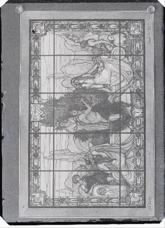 Negativo fotográfico sobre vidrio, en blanco y negro, de una vidriera modernista. Representa a Orfeo tocando la lira en un entorno bucólico rodeado de musas. En la parte superior de la escena, en la ...