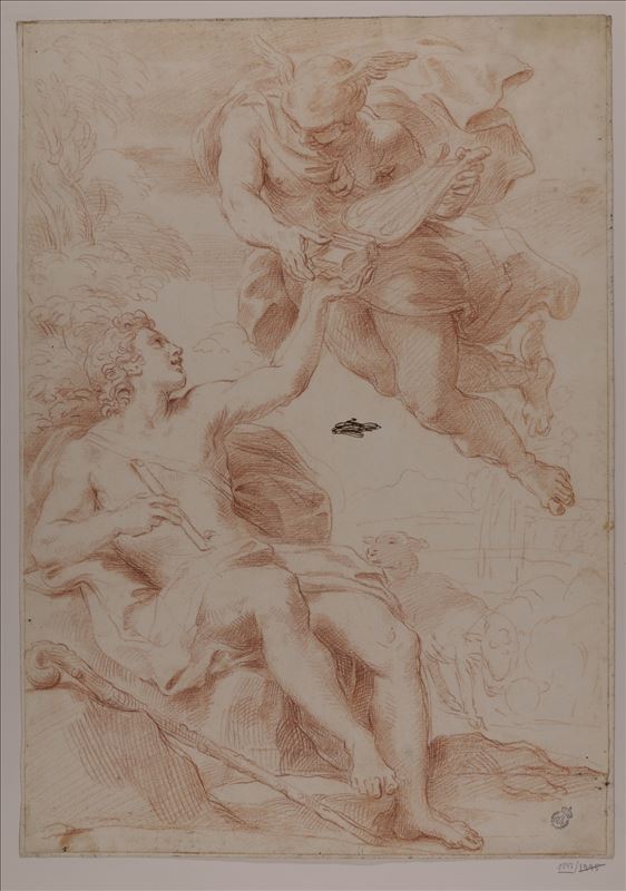 Orfeo se encuentra en el extremo inferior izquierdo sentado sobre unas rocas junto a unas ovejas. En su mano derecha sostiene una flauta de pan. Con la mano izquierda recibe la lira que le entrega ...