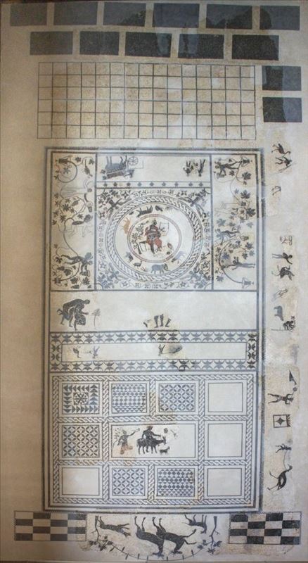 Orfeo sentando sobre una roca tañendo su lira rodeado de animales, entre ellos: un león, un puma, un tigre, un oso (todo ellos, debajo de sus pies), pájaros, un cigüeña (sobre su cabeza y ...