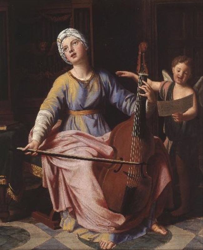 En la escena podemos ver a Santa Cecilia, tañendo una viola da gamba, acompañada de un ángel. La joven aparece sentada con el instrumento entre las piernas, mirando hacia la parte superior de la ...
