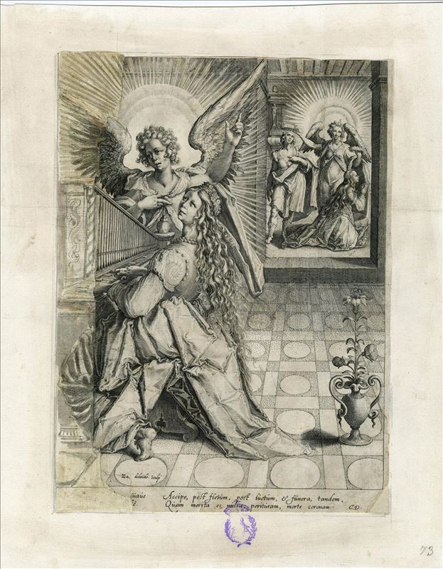 La Virgen, con el niño Jesús sentado en sus piernas, se encuentra en un interior, rodeada de ángeles. A sus pies, en la parte inferior de la composición se han representado dos ángeles músicos que ...