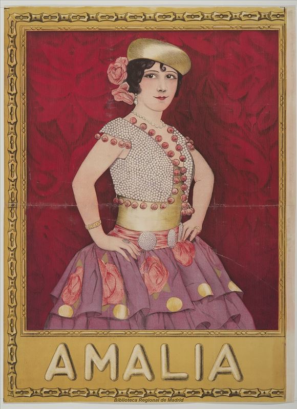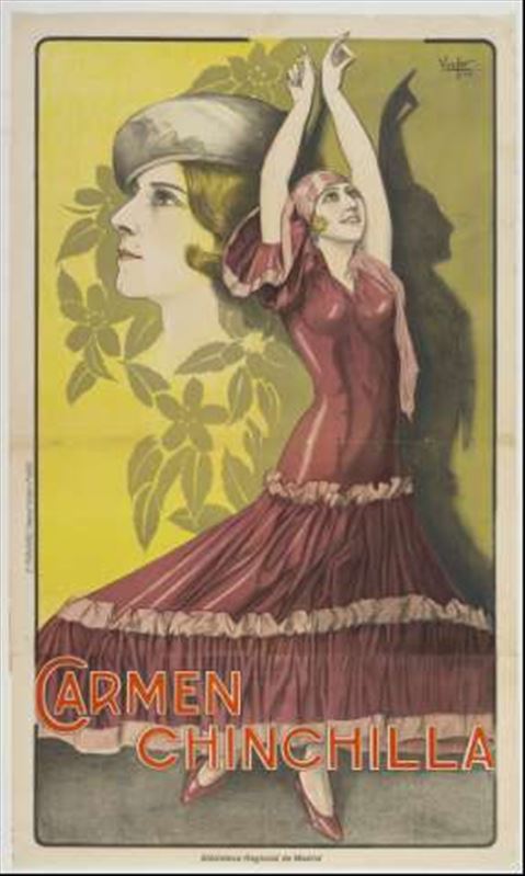 Cromolitografía sobre ilustración de César Fernández Ardavín (Vinfer) de la bailarina Carmen Chinchilla, firmada junto con la numeración "1004" en la parte superior derecha. Cartel formado por dos ...