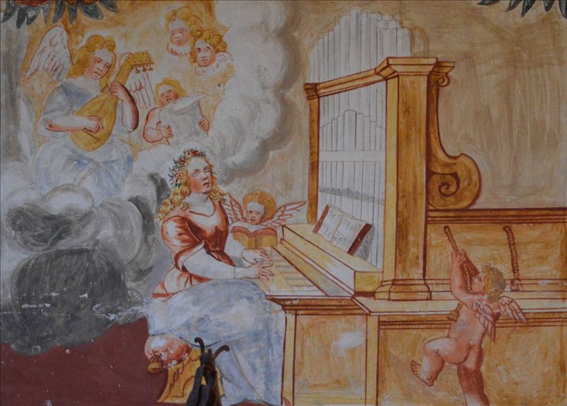 El lienzo, muy oscuro, repintado y con barnices modernos, representa un medallón ovalado con la figura de paja de Santa Cecilia, la cual aparece tañendo un teclado de órgano mientras alza la mirada ...