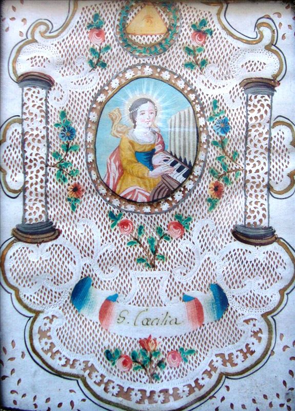 Se trata de un cuadro gouache sobre papel recortado, de forma rectangular, que ilustra a Santa Cecilia, patrona de los músicos, tocando un órgano. Posiblemente obra conventual de autor desconocido, ...