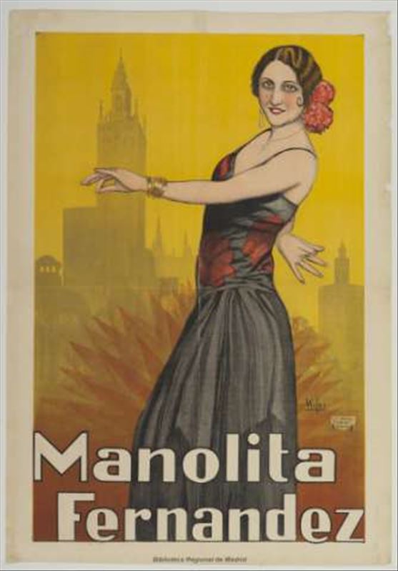 Cartel cromolitográfico representando un retrato lateral de la actriz y cantante Blanquita Giménez en ilustración de César Ferández Ardavín firmado como "Vinfer". La imagen muestra a la actriz en ...