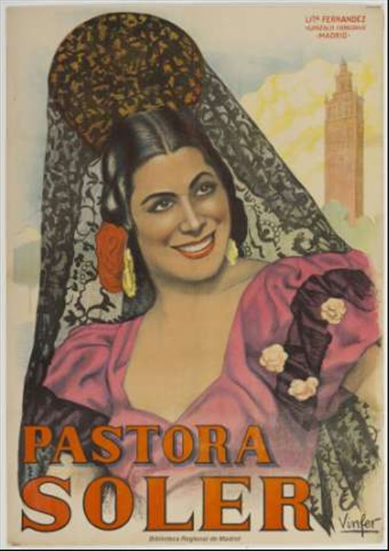 Cartel en cromolitografía de la cantante Pastora Soler sobre ilustración de César Fernández Ardavín (Vinfer) con firma del autor en la esquina inferior derecha. Retrato frontal en busto de la ...