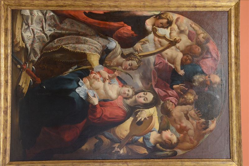 En el centro de la composición se encuentra María vestida con túnica roja y manto azul, con el niño en sus rodillas. Este le da la mano a Santa Catalina, ataviada con ropajes apropiados para esta ...