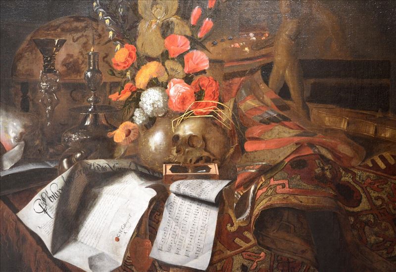 Conjunto de elementos, dispuestos sobre una mesa: libros, flores, partituras, un violín, una calavera y otros elementos decorativos de uso cotidiano. Se corresponde con la escuela flamenca debido a ...