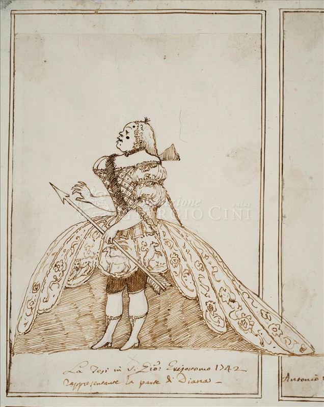 Carlo Broschi estuvo en España entre 1737 y 1759. El castrato, vestido para actuar, de pié con su cabeza de perfil izquierdo, su mano hacia adelante y sus piernas separadas. Lleva un turbante de ...