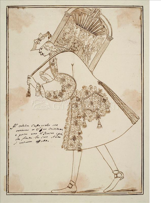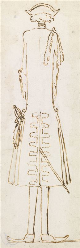 La Tesi estuvo en España en 1739 y 1740. La caricatura fechada en 1742, nos muestra su poderío físico. Vemos su perfil izquierdo con peluca, coleta posterior, lunares y gargantilla. Un corpiño ...