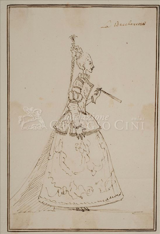 Estampa nº 9 de una serie de escenas populares italianas en la que se ve a un pastor gaitero y una mujer con un niño sobre un asno.