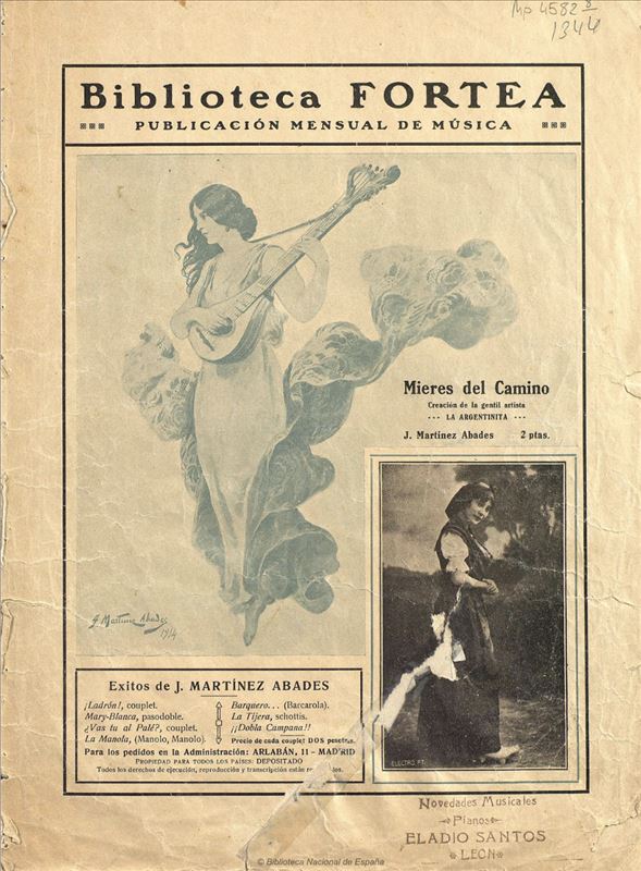 Portada de partitura en la que aparece la ilustración de una mujer portando un instrumento de cuerda pulsada y la fotografía de otra mujer con traje regional asturiano. En la primera página de la ...