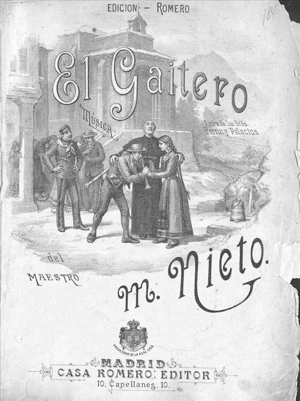 Portada de partitura en que se observa la imagen de un gaitero sujetando una gaita en una escena de tipo cómica. «El gaitero. N. 1. Introducción y dúo: zarzuela en un acto» / letra de los Sres. ...
