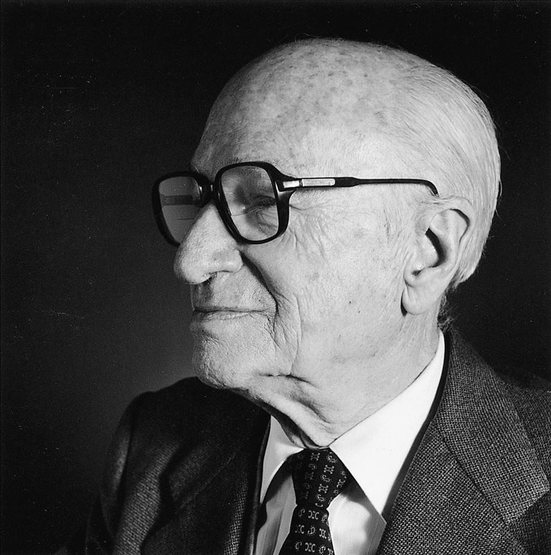 Fotografía de Rodolfo Halffter Escriche (1900 - 1987) a sus ochenta y cinco años. Se trata de una imagen en blanco y negro en la que aparece el perfil del compositor.