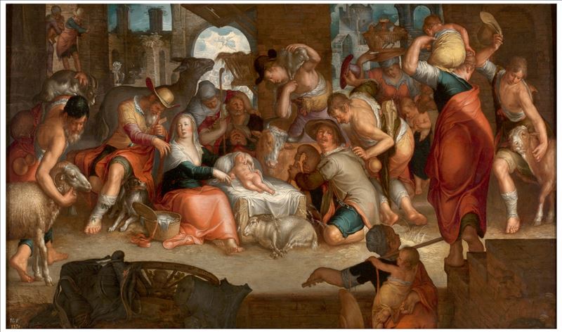 En la escena se ha plasmado el momento en el que unos pastores veneran al Niño Jesús recién nacido. La pintura se sitúa en un edificio en ruinas, el cielo con tonos anaranjados muestra un atardecer. ...