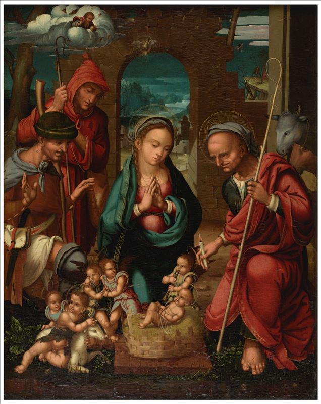 Esta pintura tiene una clara predominancia de los colores oscuros, dando un ambiente nocturno. La iluminación más importante recae sobre la Virgen María y el niño Jesús, seguido de cuatro angelotes ...
