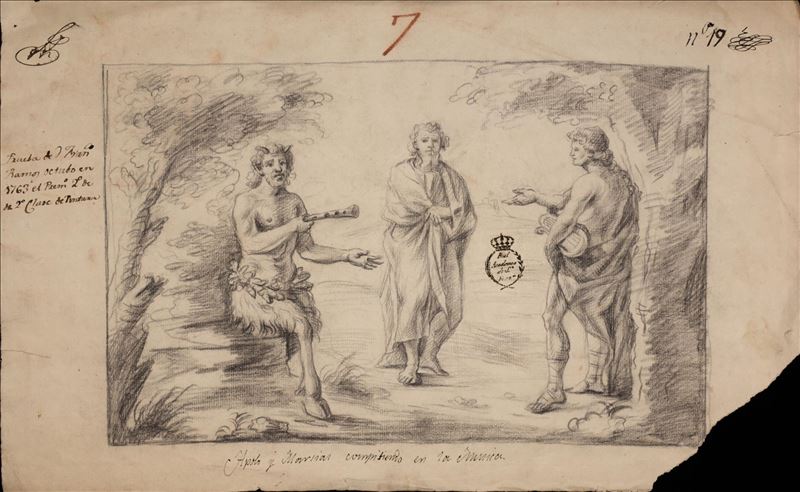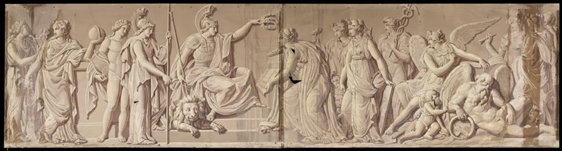 Minerva, como protectora de las Bellas Artes, les reparte las coronas de Mérito. También se aprecian las figuras de las musas mientras la Fama, a la derecha, anuncia la gloria del Mérito tocando las ...