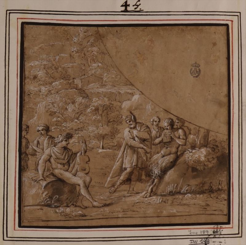 El dibujo representa la contienda de Apolo y Marsias ante la mirada de el rey Midas. La escena ambos contendientes están sentados en rocas con sus instrumentos, y se muestra un paisaje con árboles.