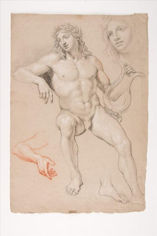 El dibujo, realizado por Francisco Javier Ramos y Albertos, representa el concurso musical narrado entre Apolo y Marsias, ambos portan sus instrumentos musicales. En el margen izquierdo se puede ...