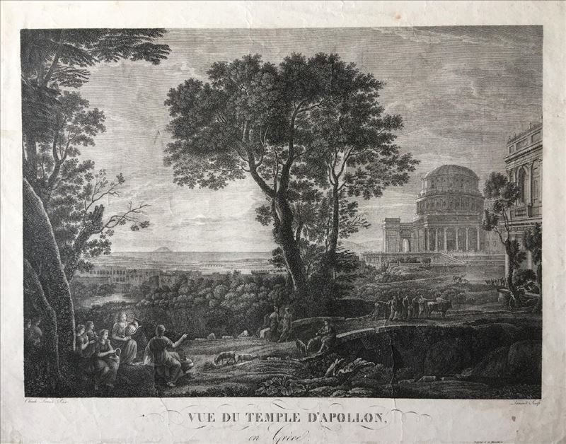Vista panorámica de un paisaje con varios personajes en primer plano, en torno a un río y un puente, árboles y dos edificios a la derecha. El del fondo, es una construcción monumental de estilo ...