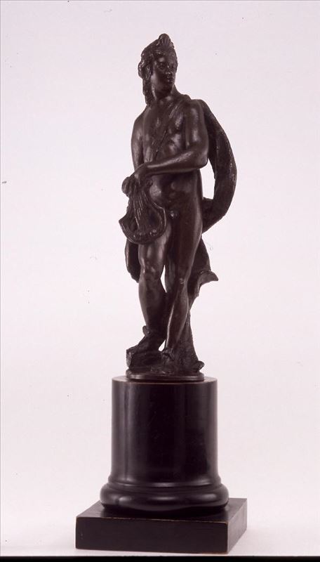 Se ha representado la figura de Apolo, de cuerpo entero, en bronce fundido a la cera, con un manto por la espalda. Sostiene una lira estilizada con la mano derecha sobre la pierna izquierda.