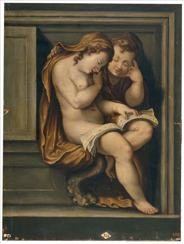 La composición presenta una pareja de figuras infantiles de poderosa anatomía sentadas en un banco con pata de león que se integra en un potente basamento arquitectónico. Ambos centran su atención en ...