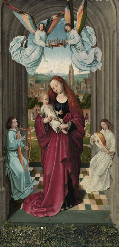 A la izquierda, Orfeo con una corona de laurel se encuentra sosteniendo una lira de 5 cuerdas. A la derecha, un ángel sujeta una trompeta; debajo, un violonchelo.