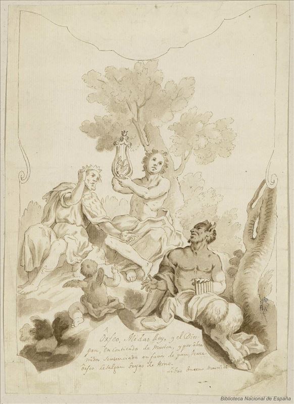 Un dibujo sobre papel amarillento verjurado : pluma, pincel, tinta y aguadas pardas. Inscripción manuscrita a tinta parda, en el borde inferior: "Ôrfeo, Midas Rey, y el Dios / pan, en contienda de ...
