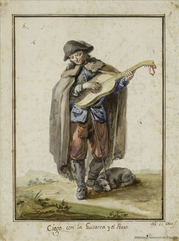 Figura masculina entera, de pie y en 3/4, vestido con ropas pobres, con sombrero y capa. Toca una guitarra, a sus pies un perro dormitando y esbozo de paisaje.