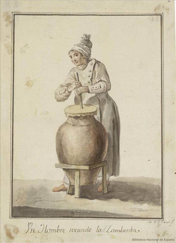 Hombre tocando la zambomba. Lleva un levitón blanco que le llega a los pies y gorro de dormir.